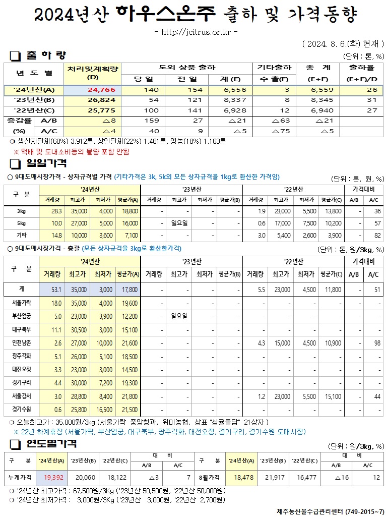[하우스온주]2024년산 출하 및 가격동향(8/06)