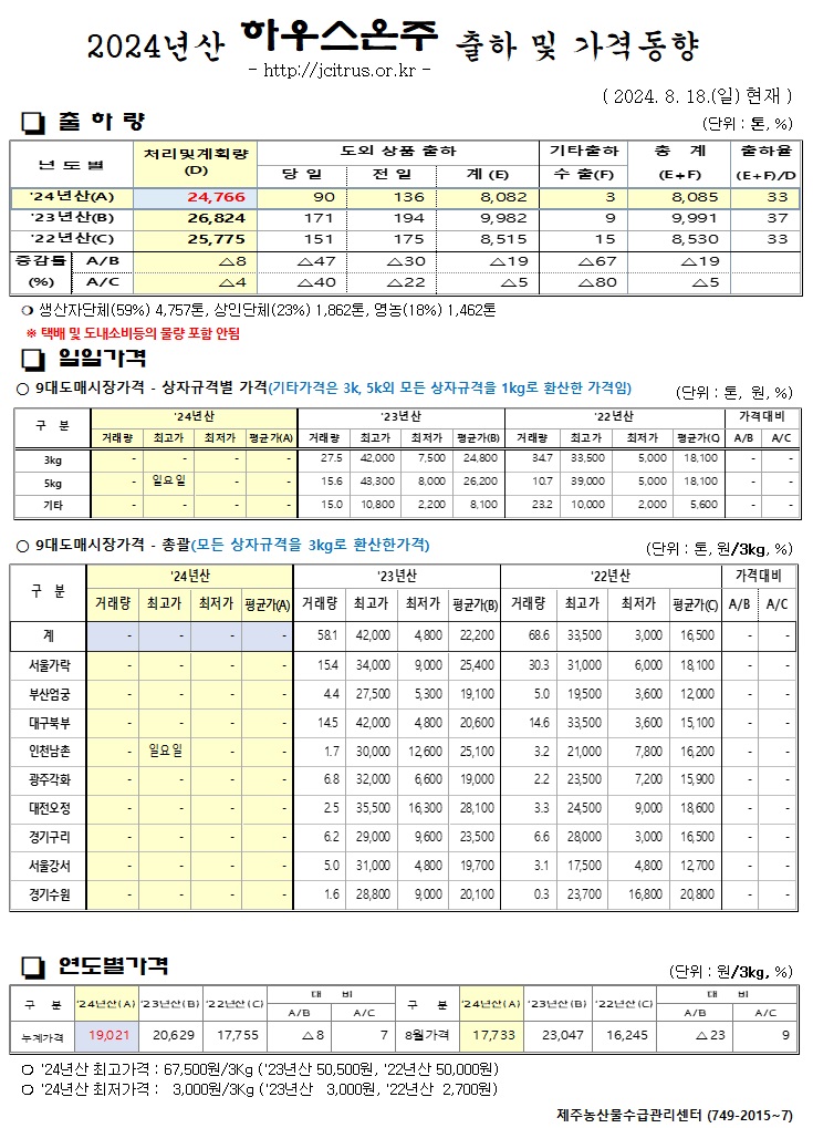 [하우스온주]2024년산 출하 및 가격동향(8/18)
