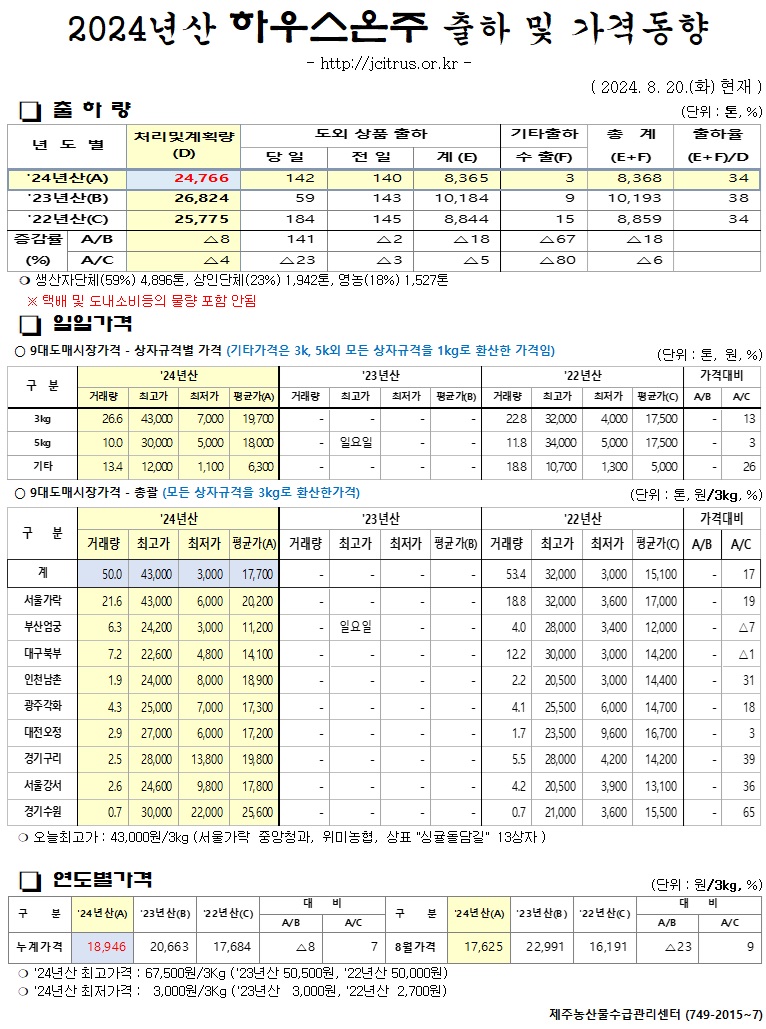 [하우스온주]2024년산 출하 및 가격동향(8/20)