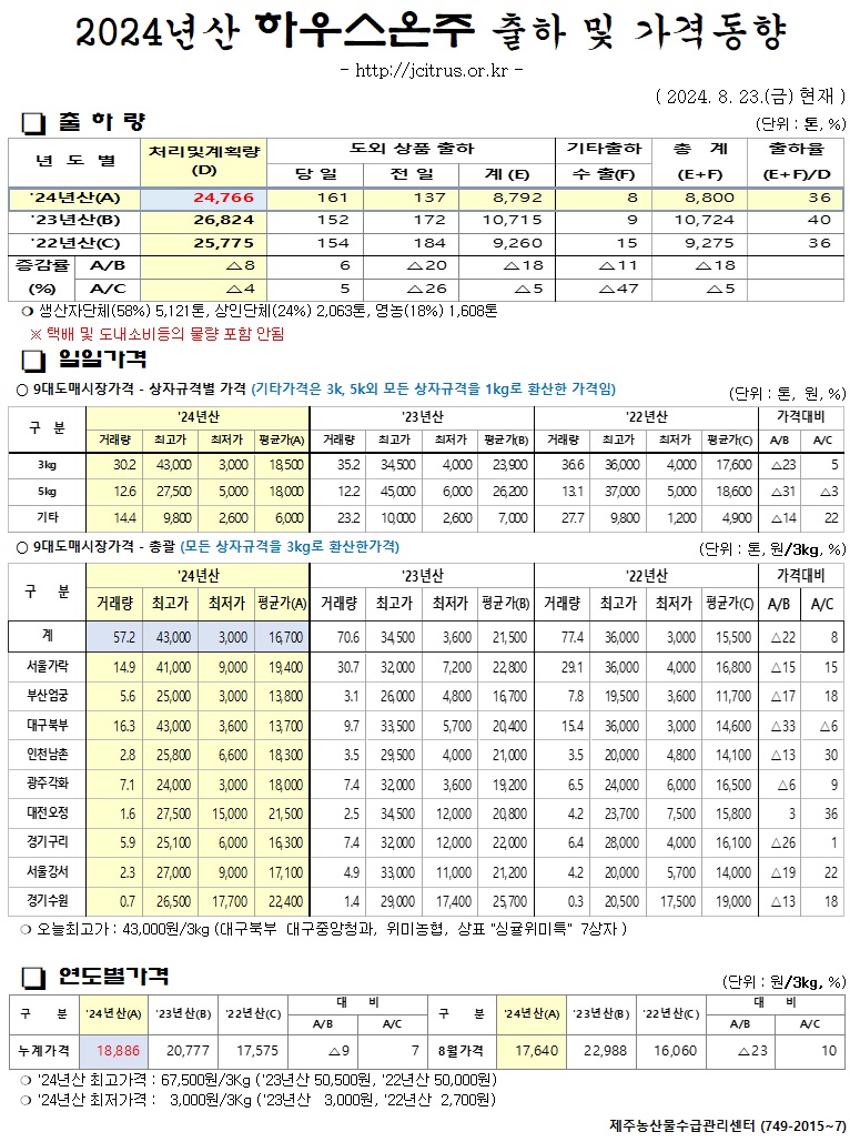 [하우스온주]2024년산 출하 및 가격동향(8/23)