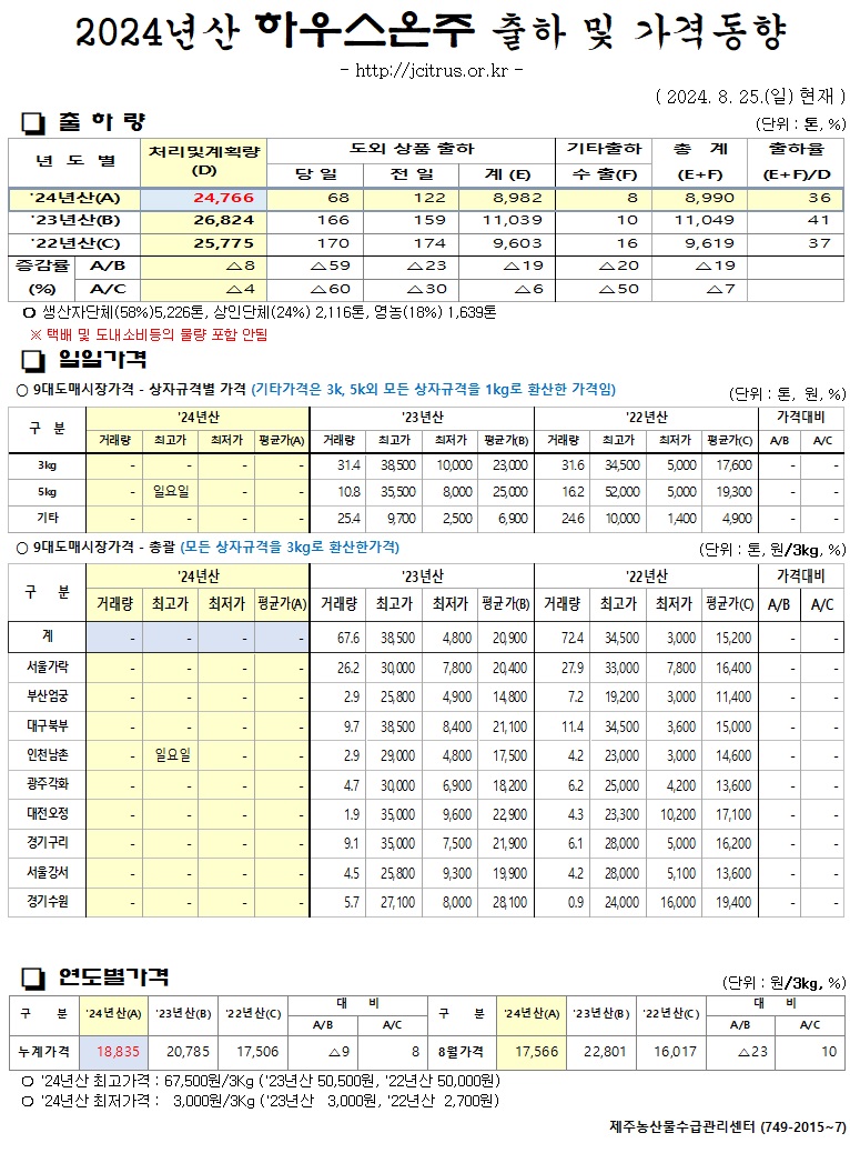 [하우스온주]2024년산 출하 및 가격동향(8/25)
