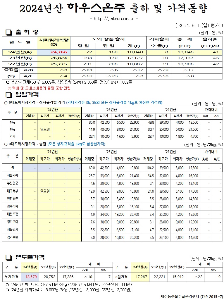 [하우스온주]2024년산 출하 및 가격동향(9/01)