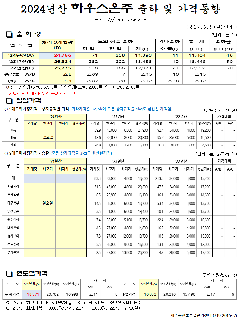 [하우스온주]2024년산 출하 및 가격동향(9/08)