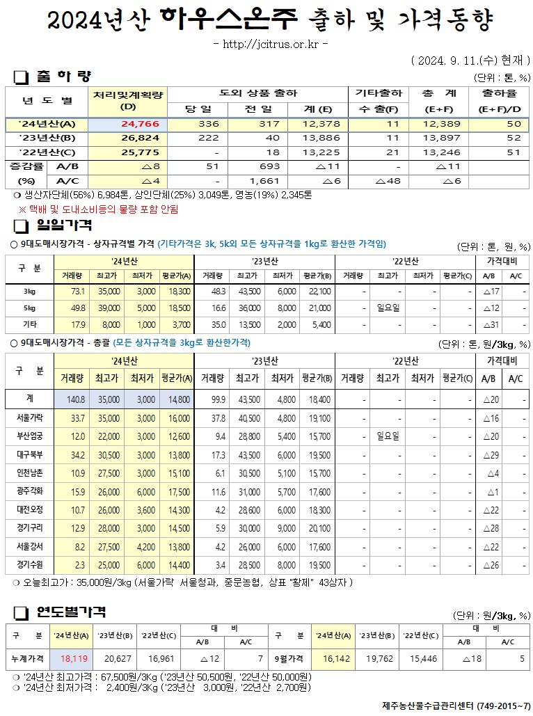[하우스온주]2024년산 출하 및 가격동향(9/11)