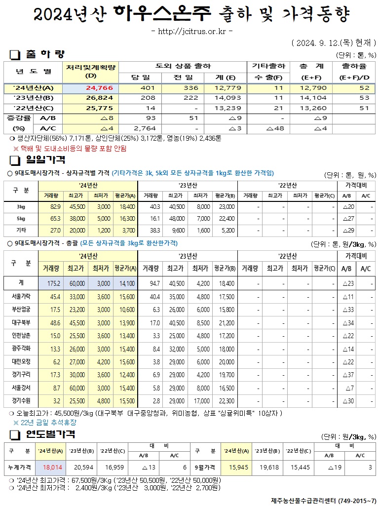 [하우스온주]2024년산 출하 및 가격동향(9/12)