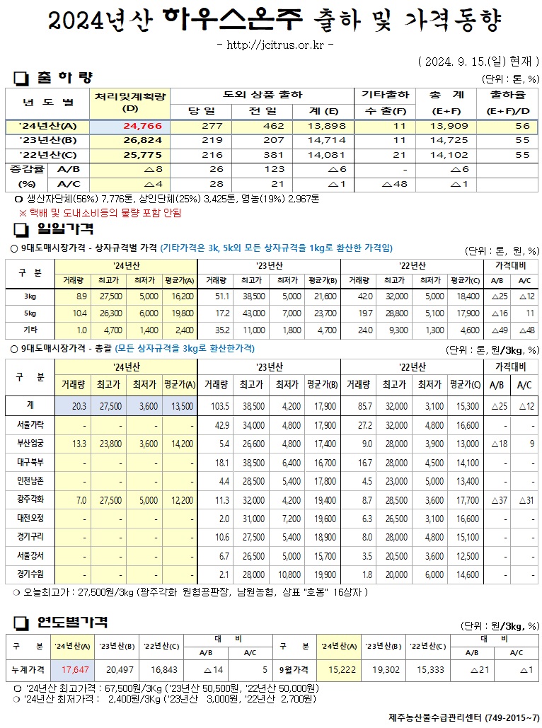 [하우스온주]2024년산 출하 및 가격동향(9/15)