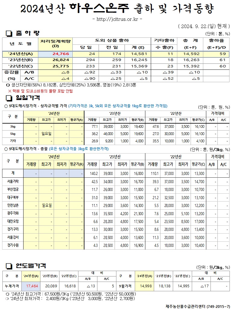 [하우스온주]2024년산 출하 및 가격동향(9/22)