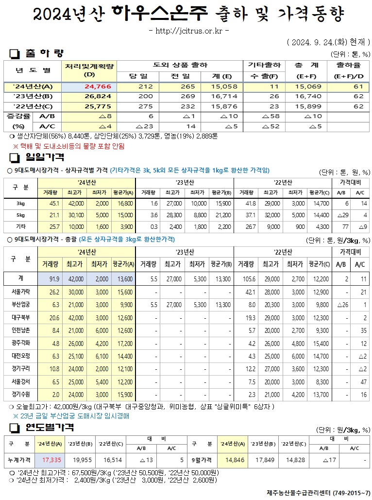 [하우스온주]2024년산 출하 및 가격동향(9/24)