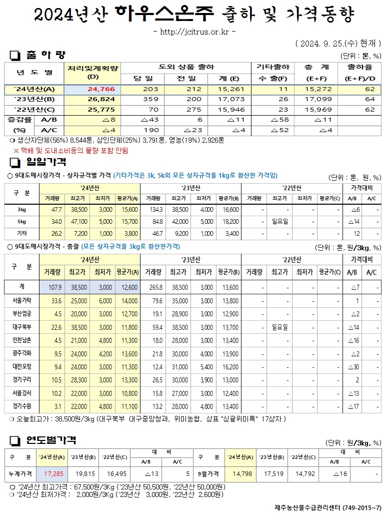[하우스온주]2024년산 출하 및 가격동향(9/25)