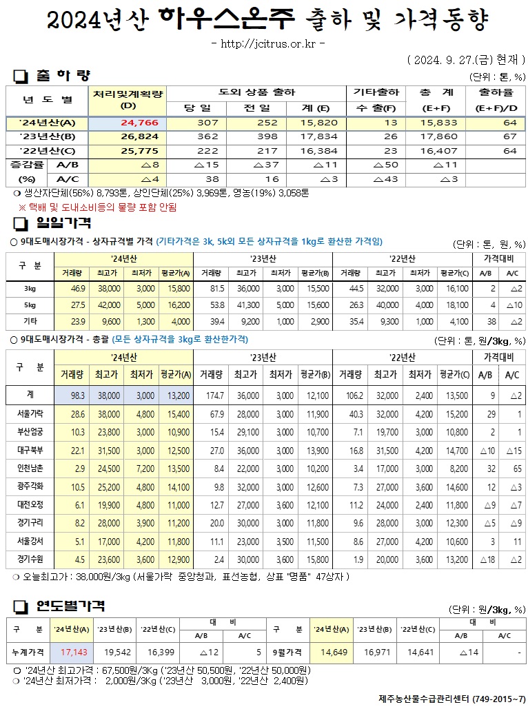 [하우스온주]2024년산 출하 및 가격동향(9/27)