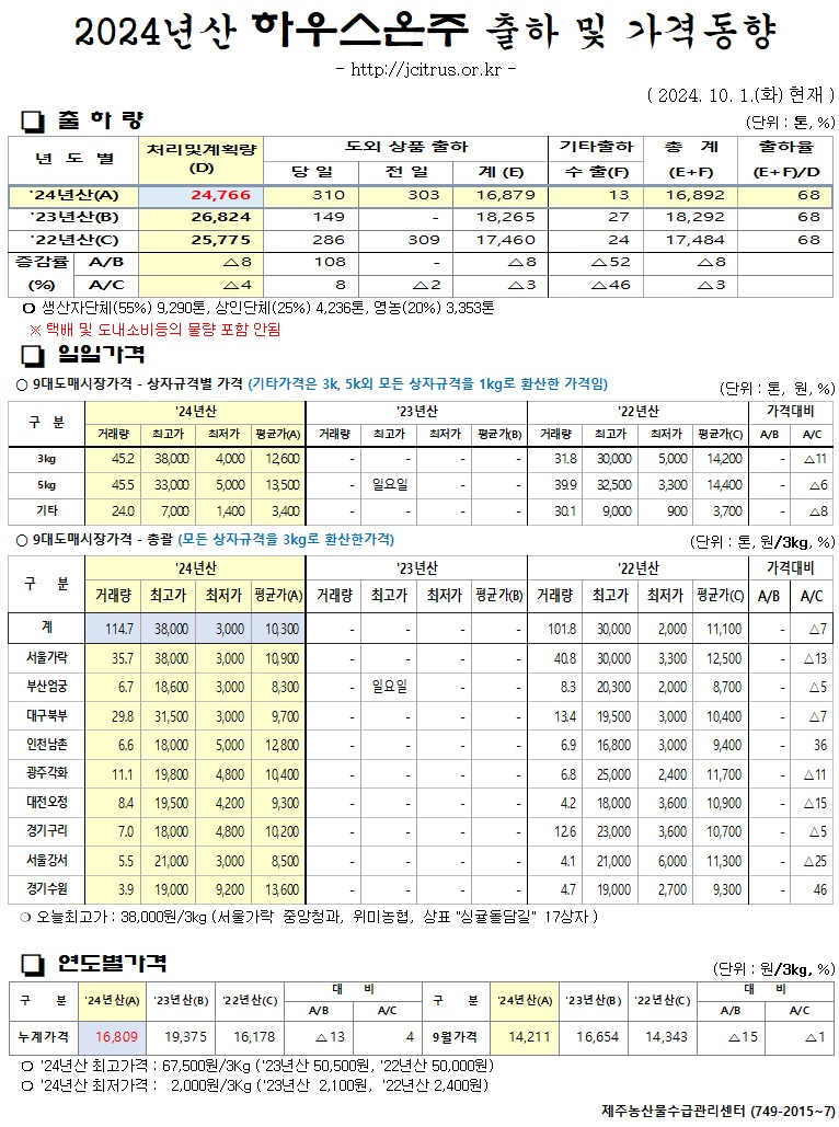 [하우스온주]2024년산 출하 및 가격동향(10/1)