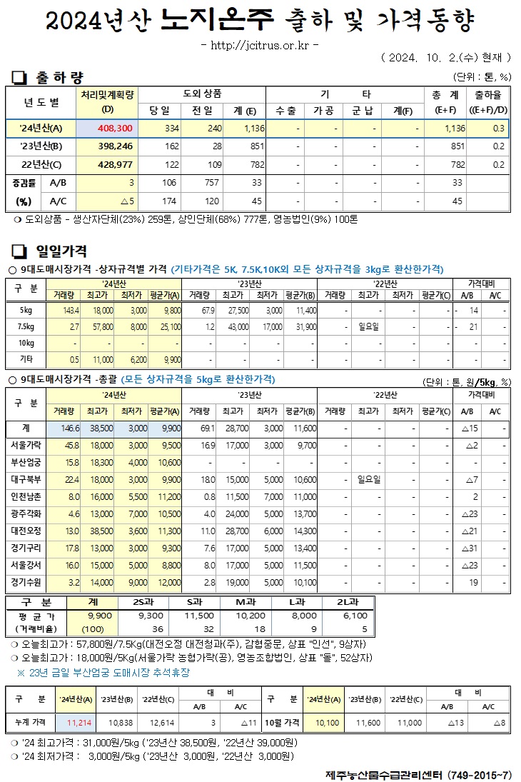 [노지온주]2024년산 출하 및 가격동향(10/2)
