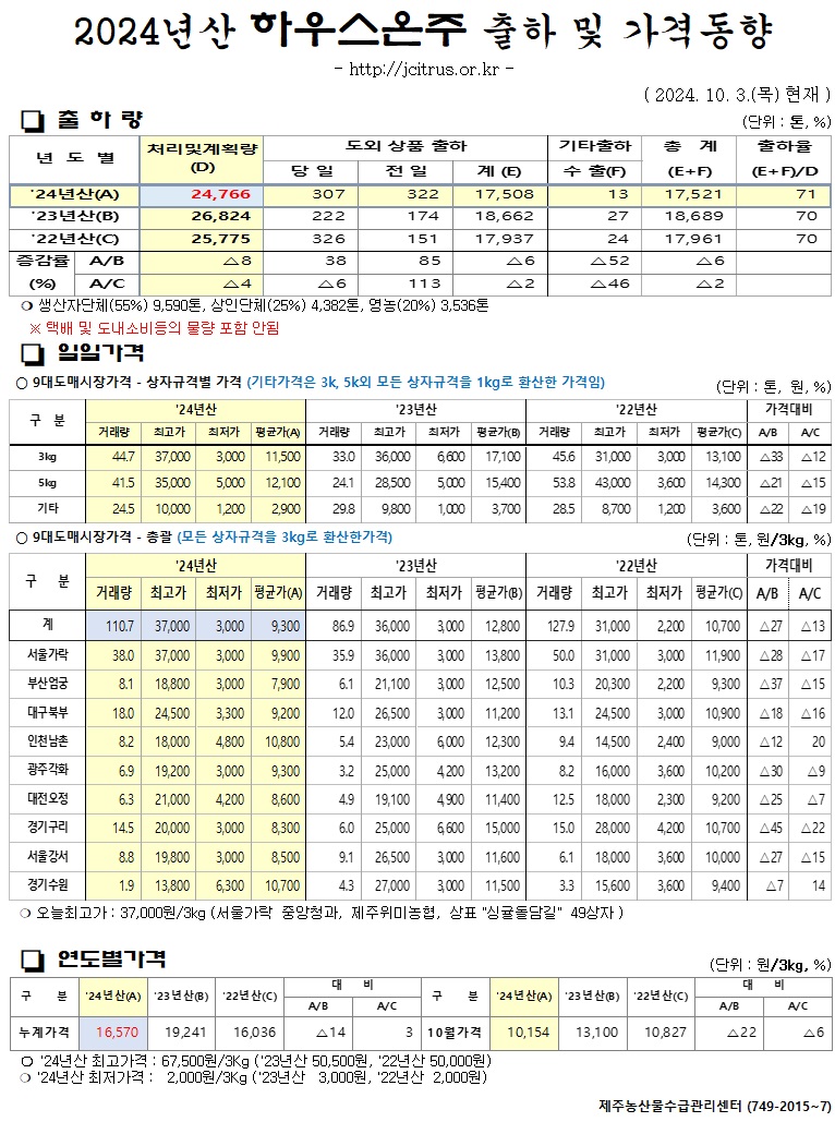 [하우스온주]2024년산 출하 및 가격동향(10/3)