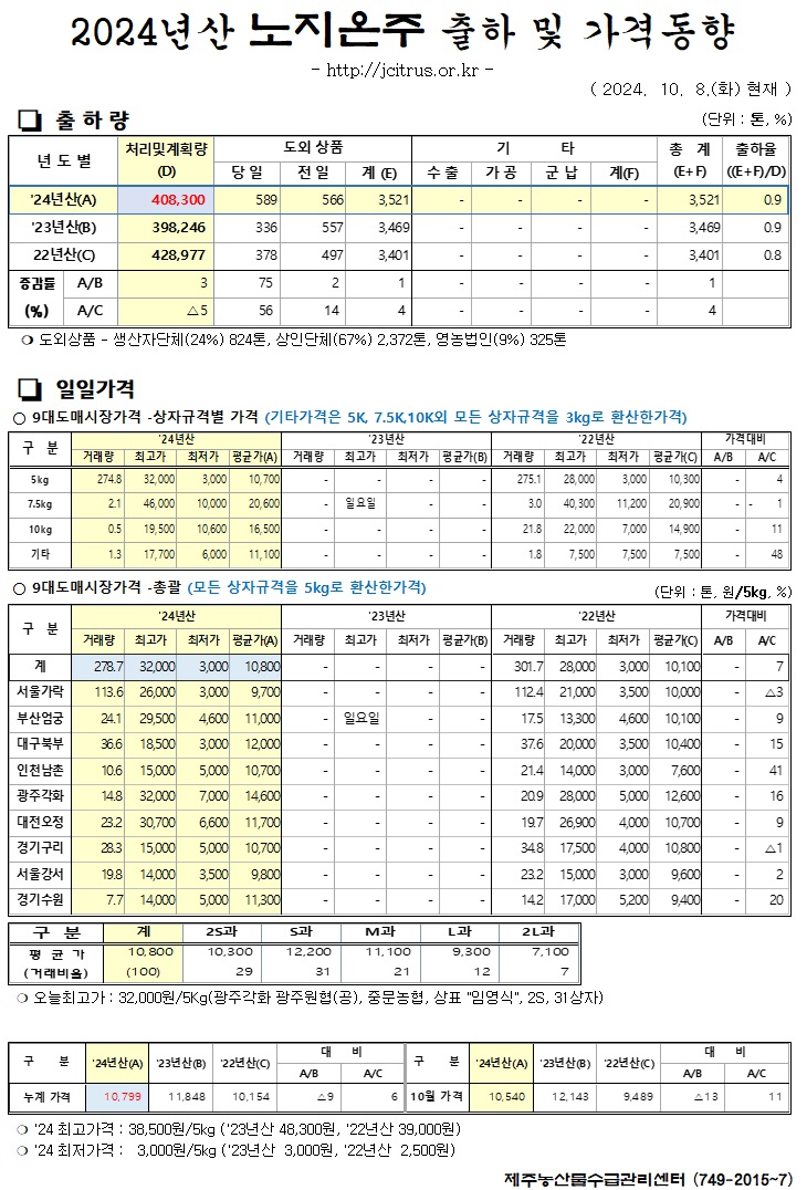 [노지온주]2024년산 출하 및 가격동향(10/8)