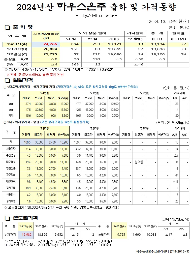 [하우스온주]2024년산 출하 및 가격동향(10/09)