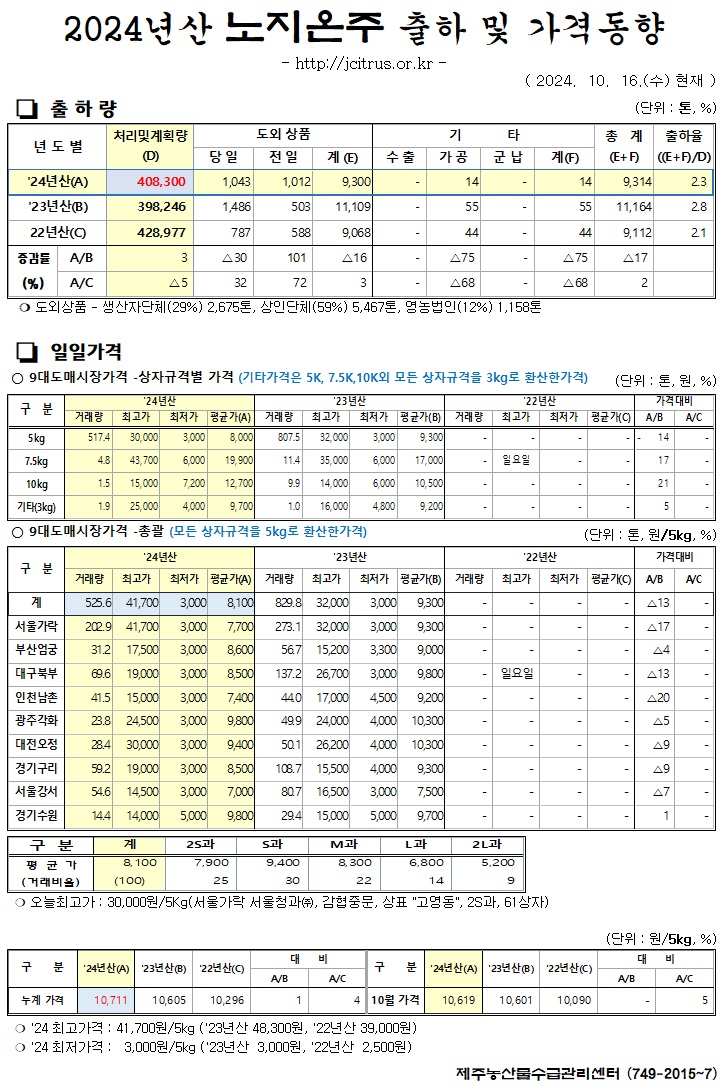 [노지온주]2024년산 출하 및 가격동향(10/16)