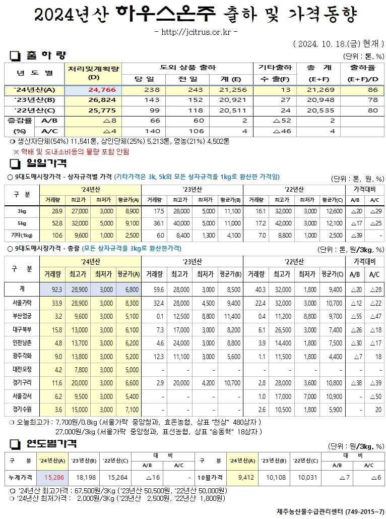 [하우스온주]2024년산 출하 및 가격동향(10/18)