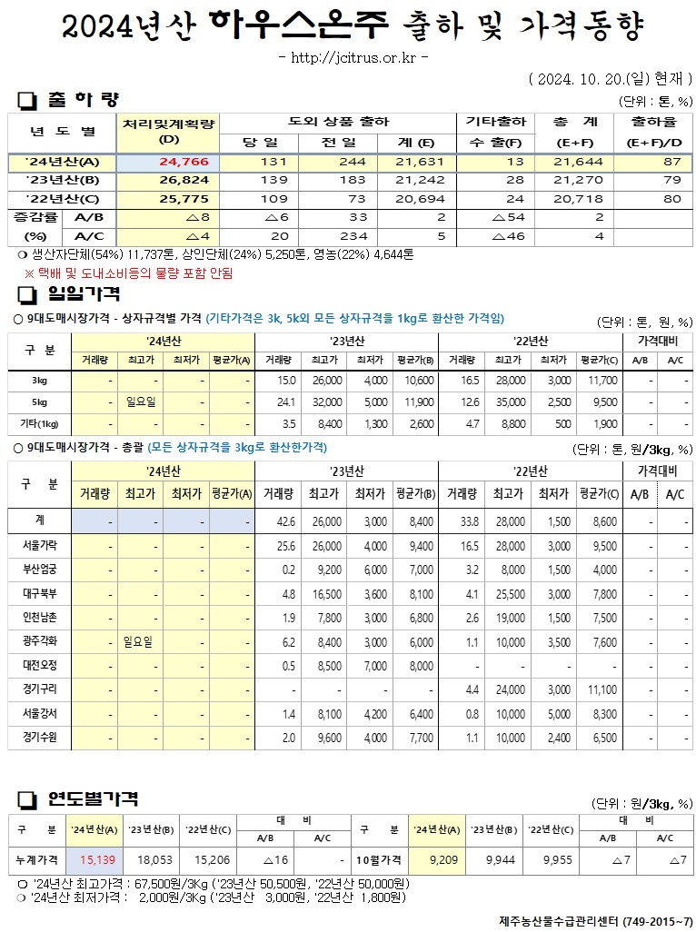 [하우스온주]2024년산 출하 및 가격동향(10/20)