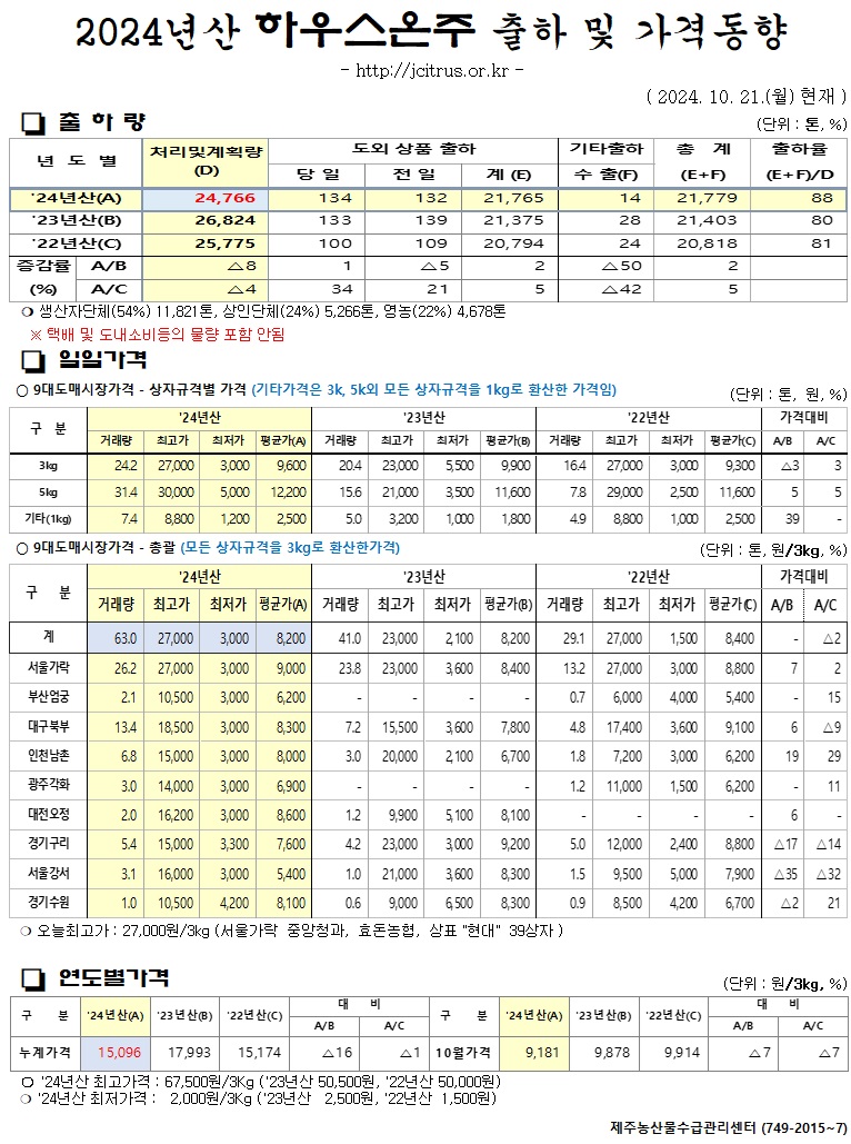 [하우스온주]2024년산 출하 및 가격동향(10/21)