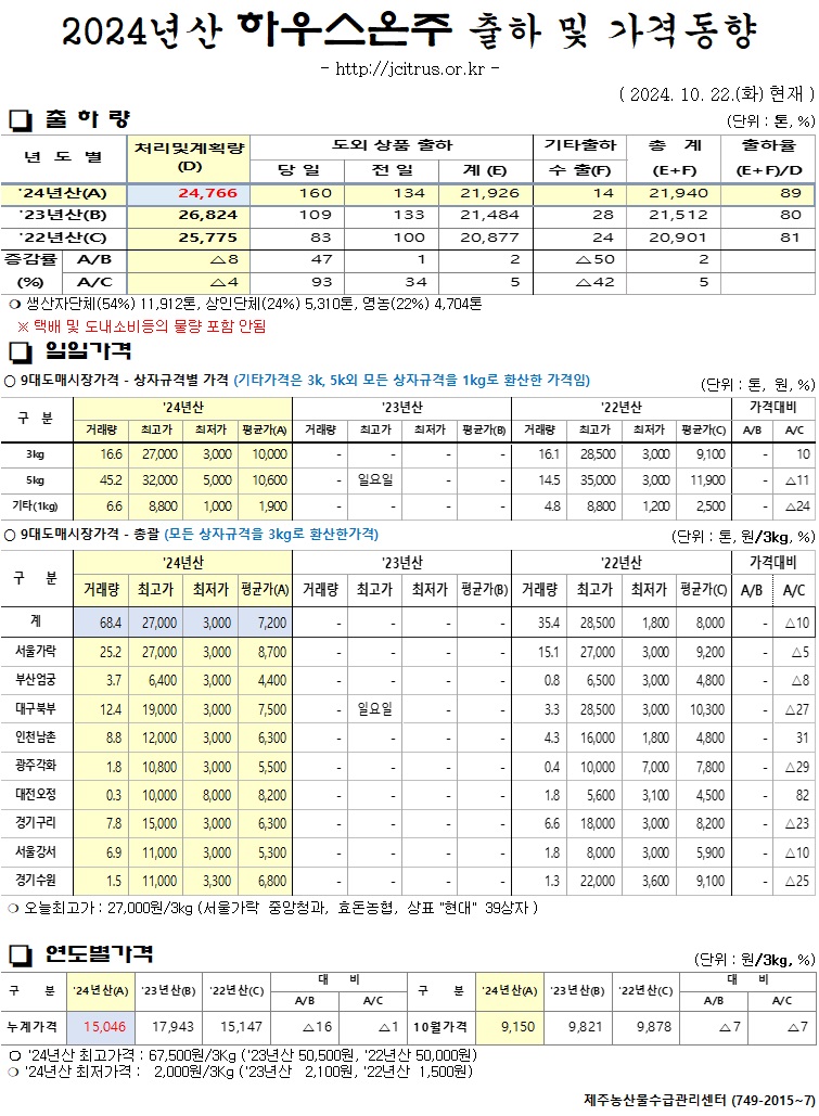 [하우스온주]2024년산 출하 및 가격동향(10/22)