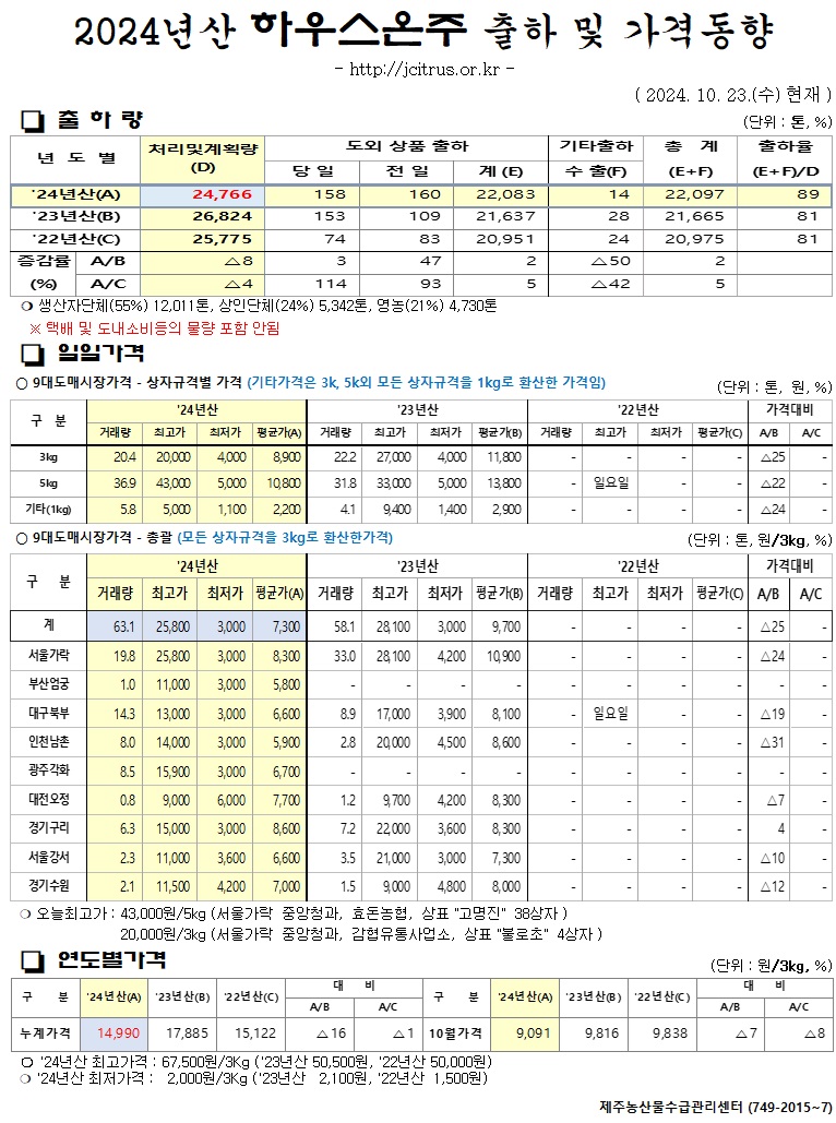 [하우스온주]2024년산 출하 및 가격동향(10/23)
