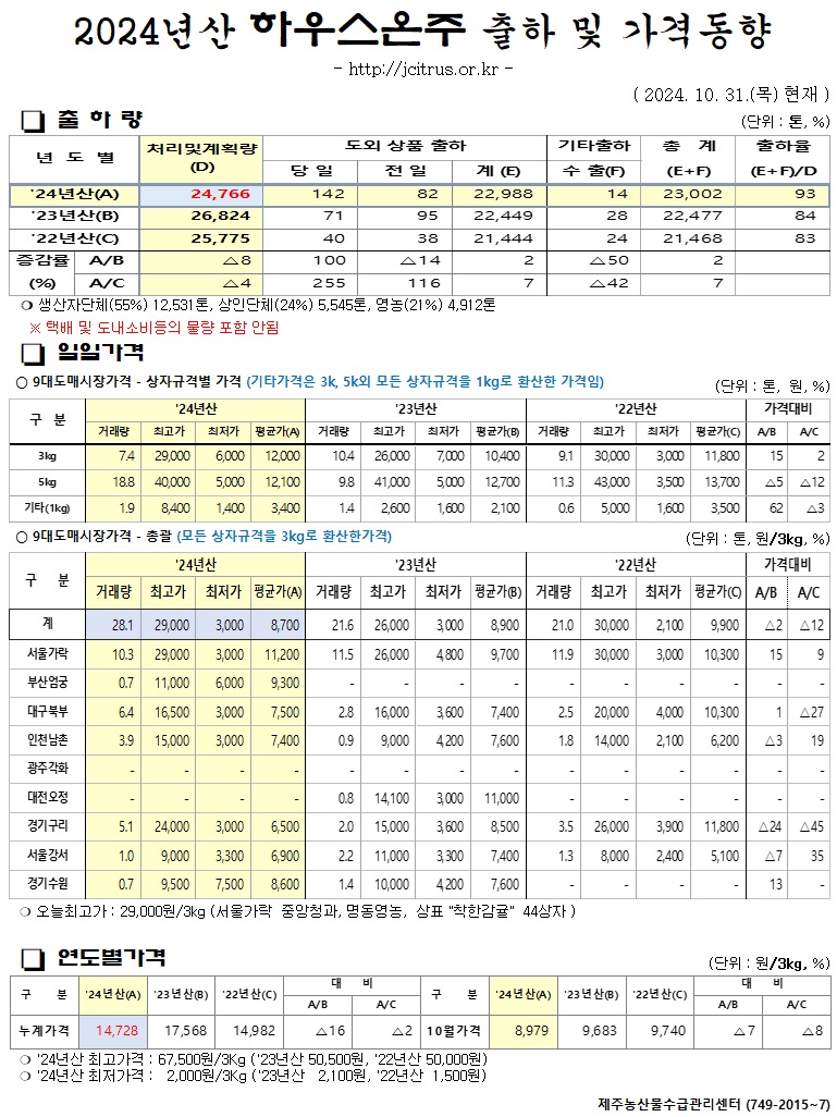 [하우스온주]2024년산 출하 및 가격동향(10/31)