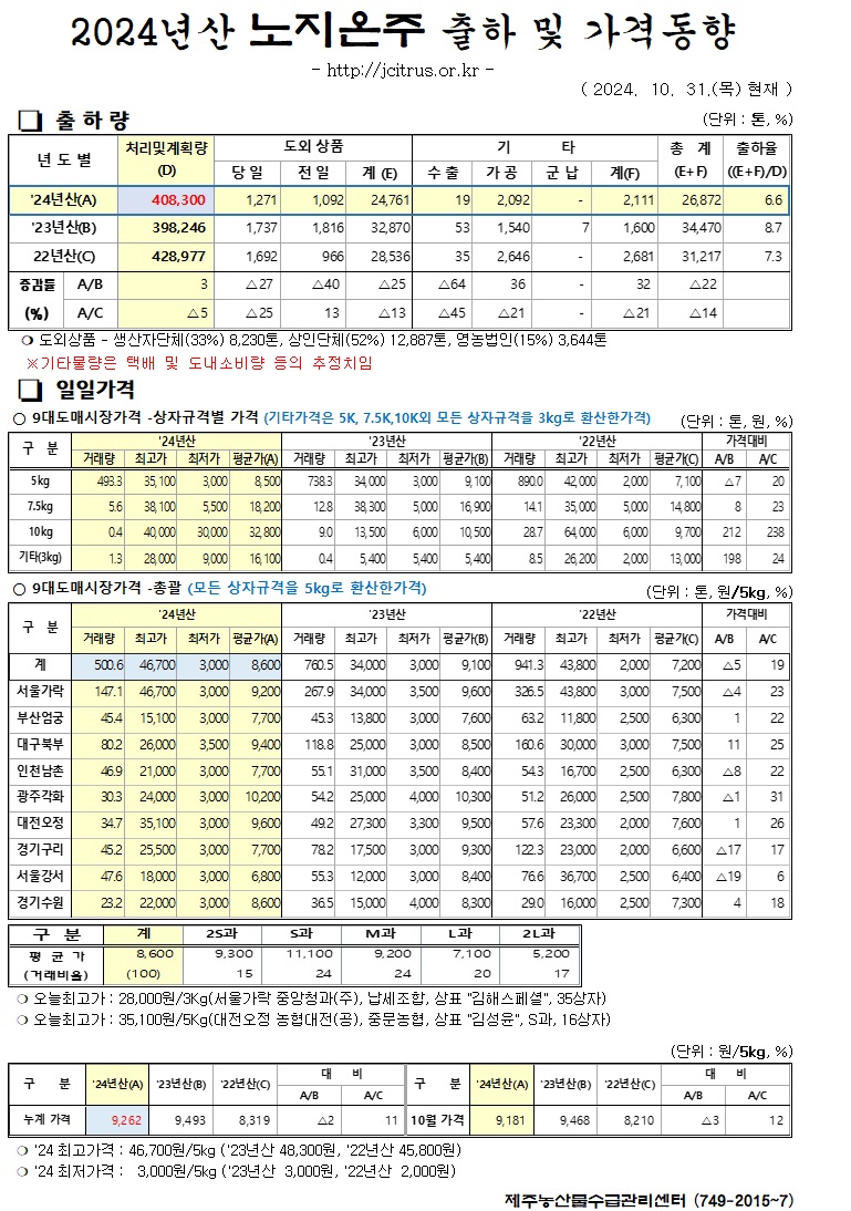 [노지온주]2024년산 출하 및 가격동향(10/31)