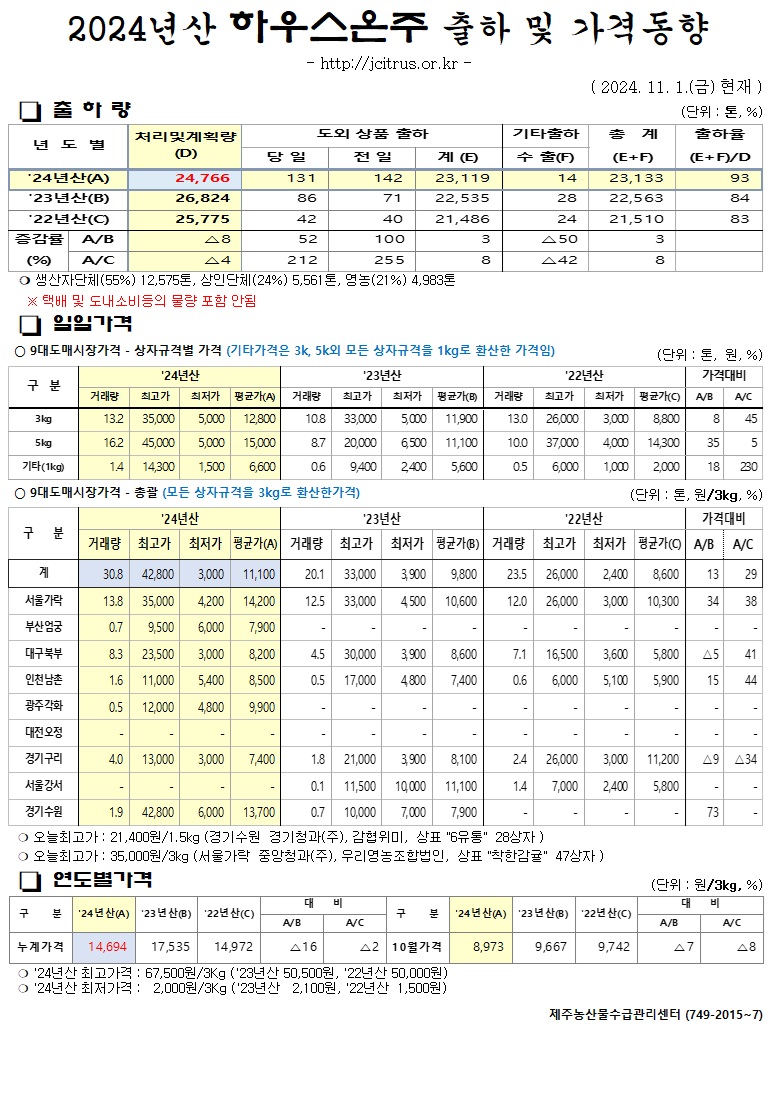 [하우스온주]2024년산 출하 및 가격동향(11/1)