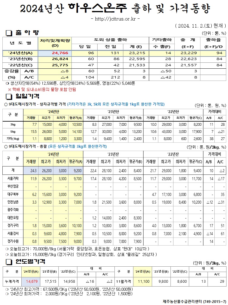 [하우스온주]2024년산 출하 및 가격동향(11/2)