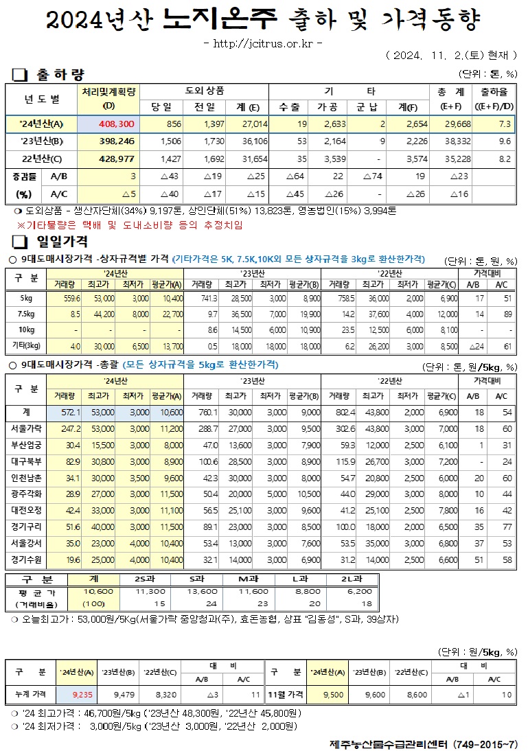 [노지온주]2024년산 출하 및 가격동향(11/2)