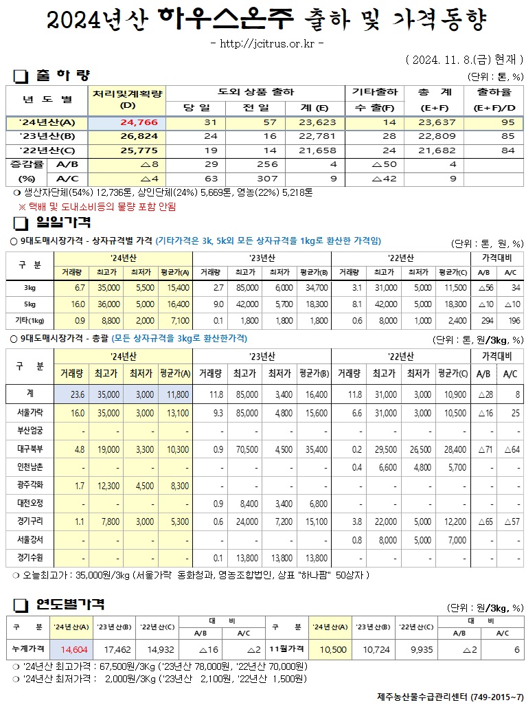 [하우스온주]2024년산 출하 및 가격동향(11/8)