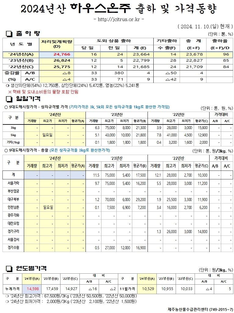 [하우스온주]2024년산 출하 및 가격동향(11/10)