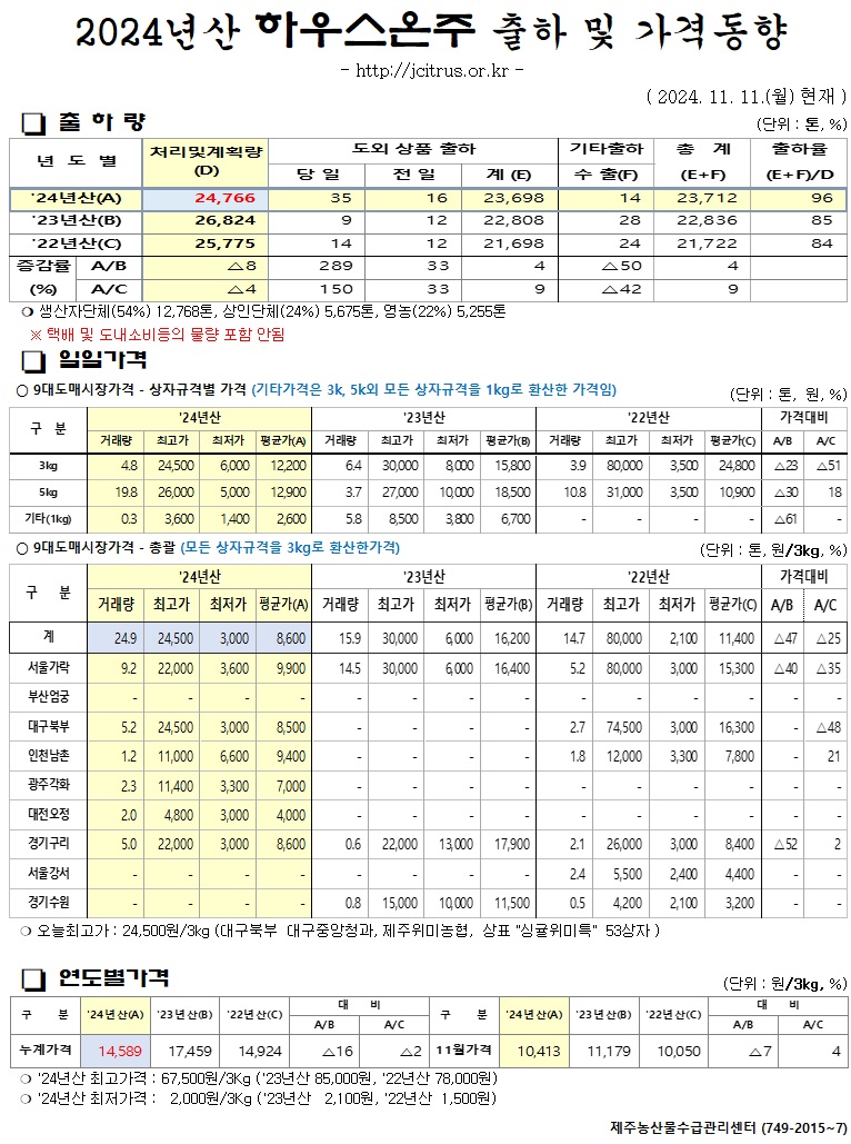 [하우스온주]2024년산 출하 및 가격동향(11/11)