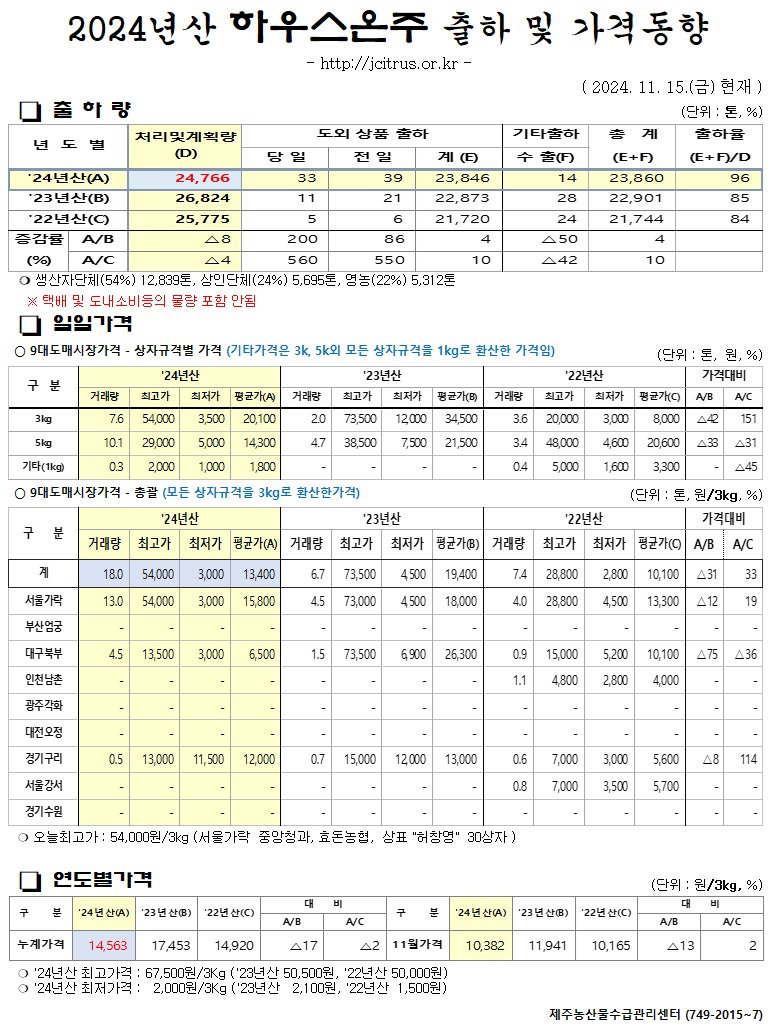 [하우스온주]2024년산 출하 및 가격동향(11/15)