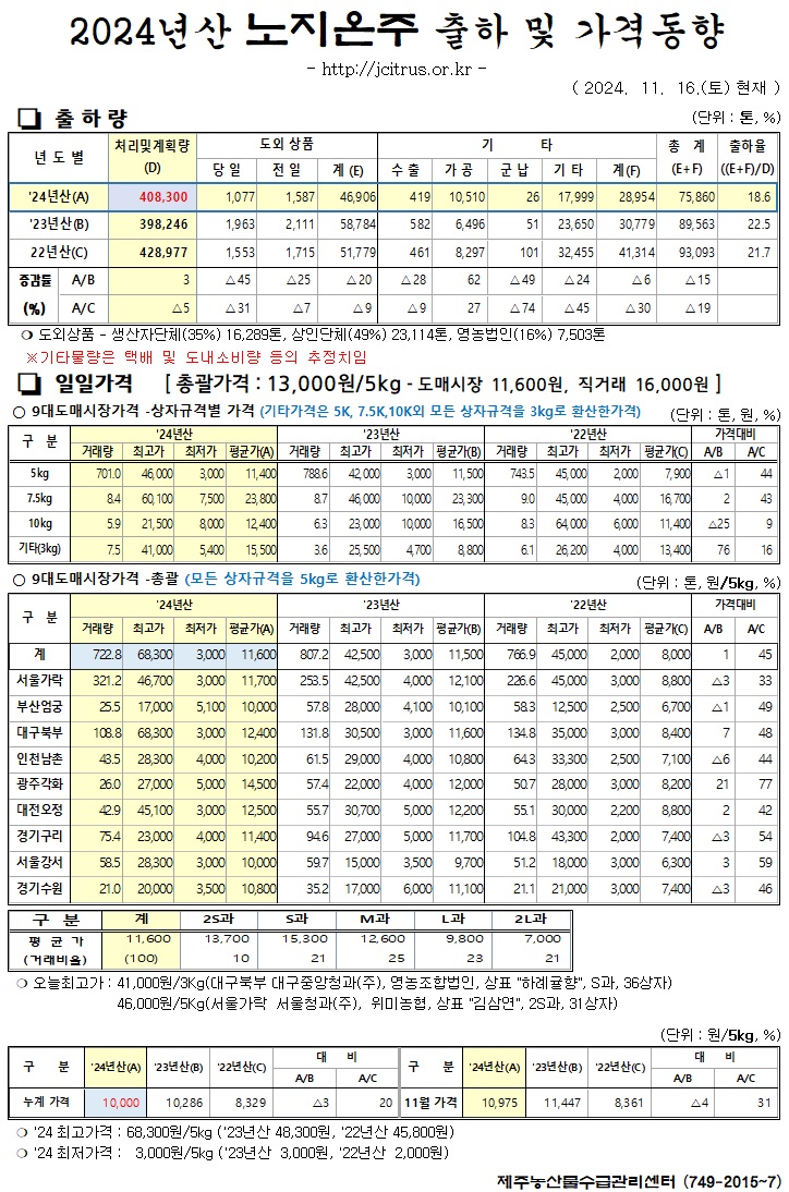 [노지온주]2024년산 출하 및 가격동향(11/16)