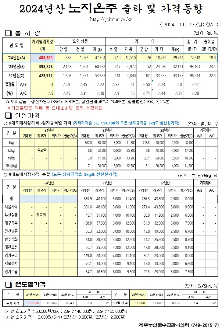 [노지온주]2024년산 출하 및 가격동향(11/17)