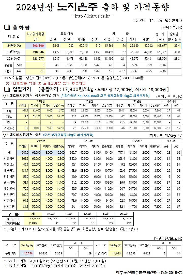 [노지온주]2024년산 출하 및 가격동향(11/25)