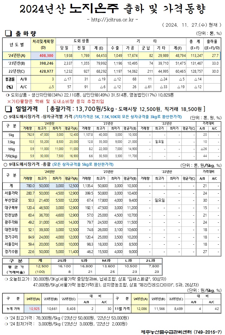 [노지온주]2024년산 출하 및 가격동향(11/27)