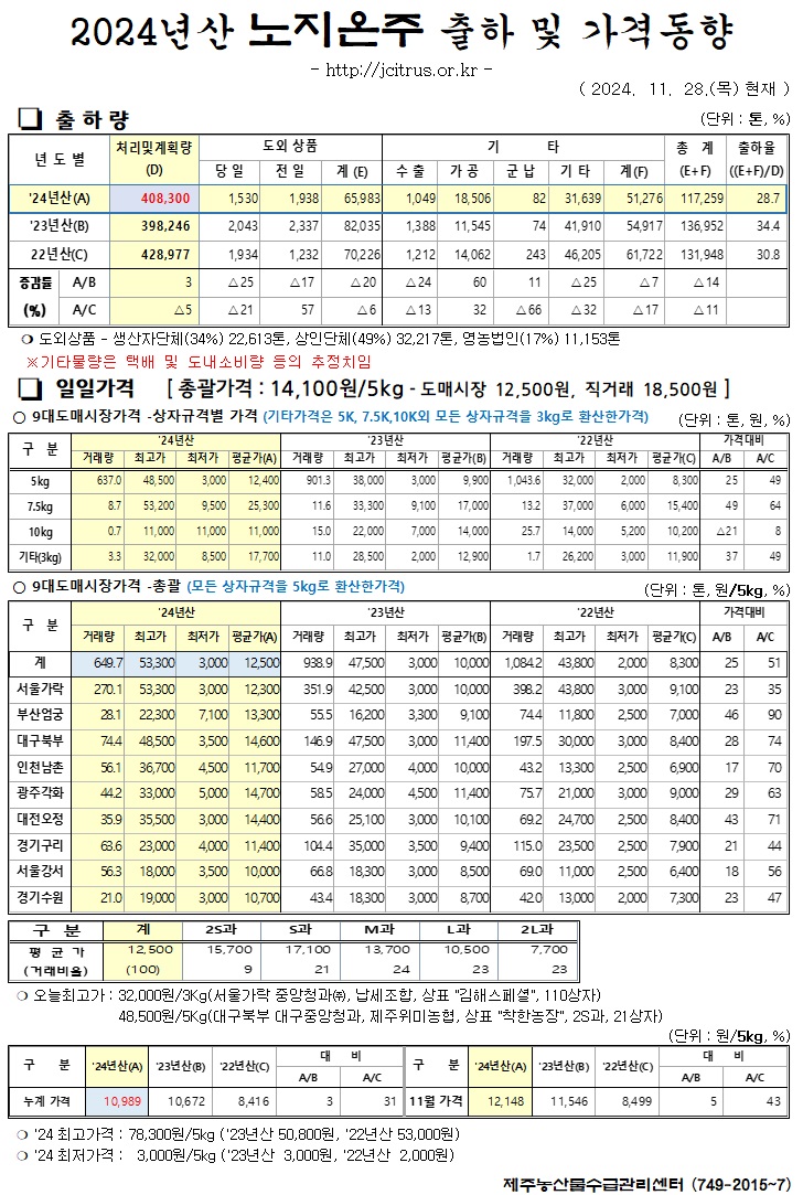 [노지온주]2024년산 출하 및 가격동향(11/28)