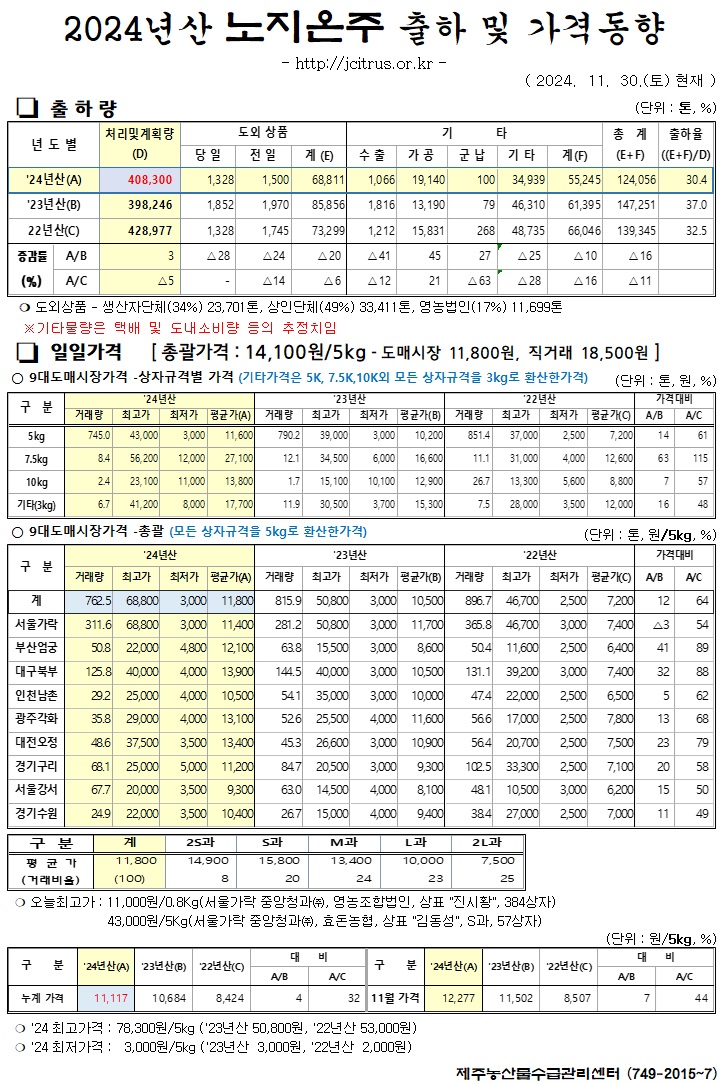 [노지온주]2024년산 출하 및 가격동향(11/30)