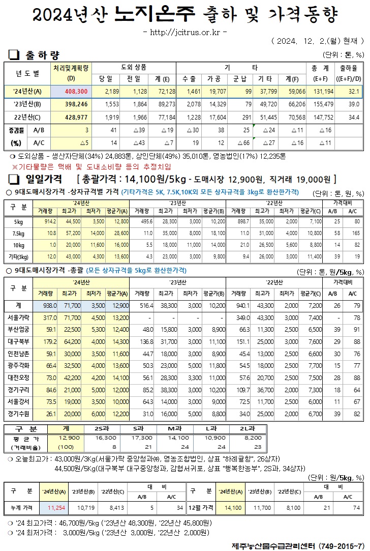 [노지온주]2024년산 출하 및 가격동향(12/2)