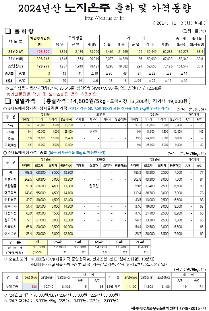 [노지온주]2024년산 출하 및 가격동향(12/3)