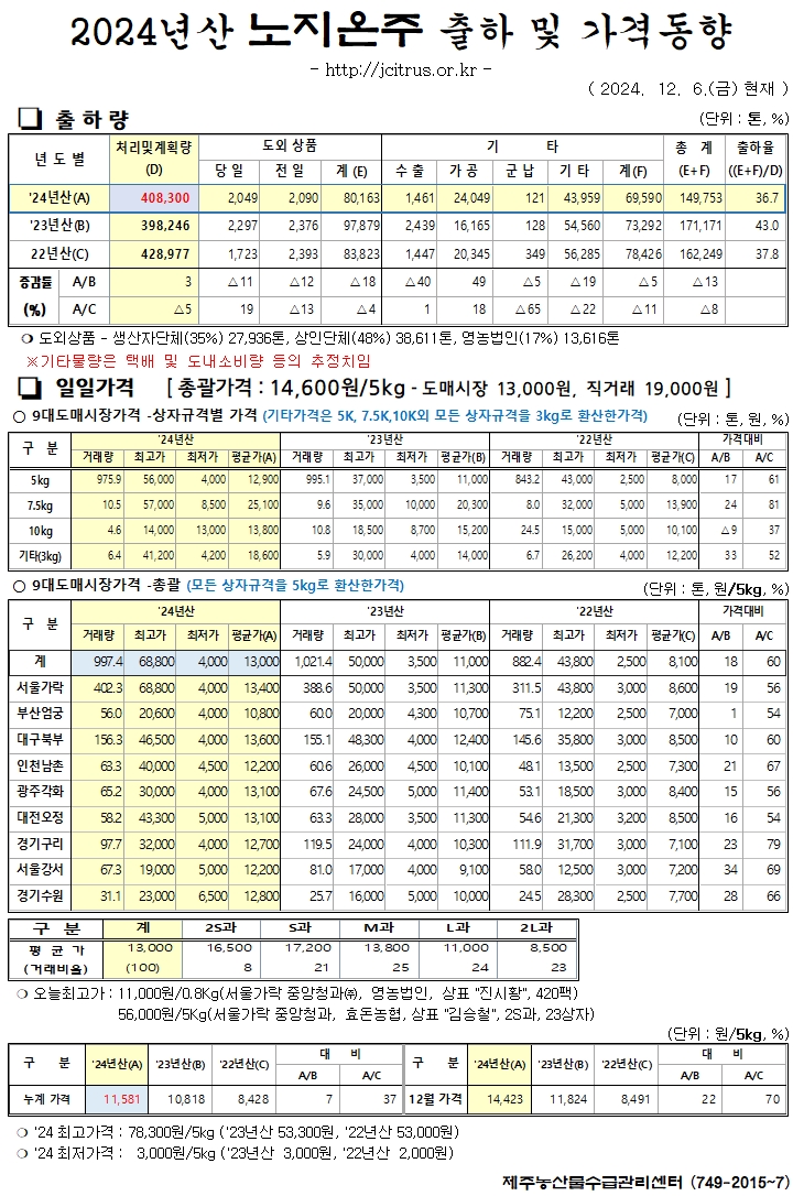 [노지온주]2024년산 출하 및 가격동향(12/6)