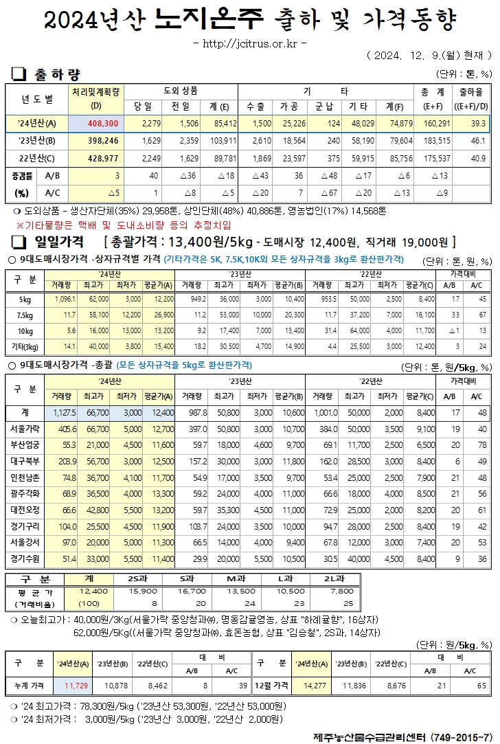 [노지온주]2024년산 출하 및 가격동향(12/9)