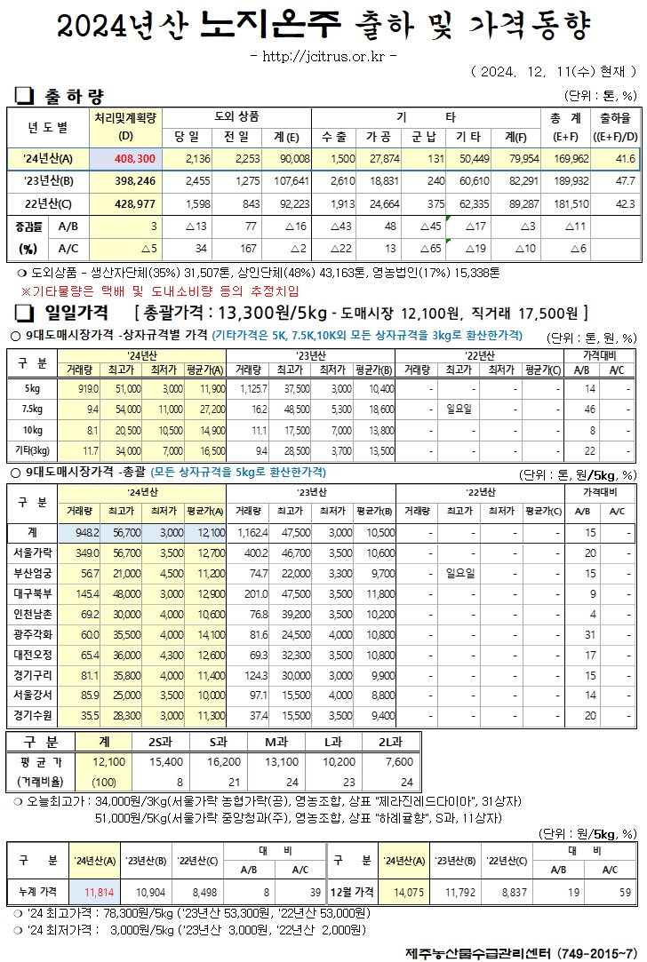 [노지온주]2024년산 출하 및 가격동향(12/11)