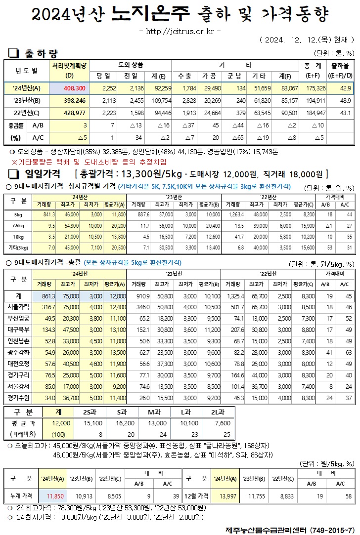 [노지온주]2024년산 출하 및 가격동향(12/12)