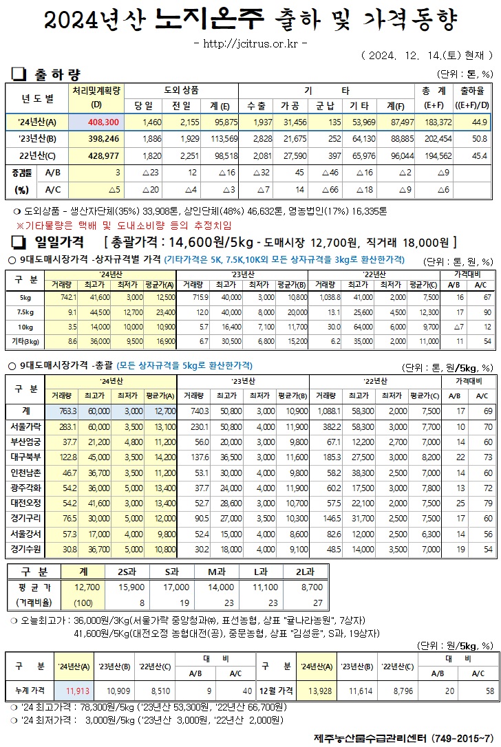 [노지온주]2024년산 출하 및 가격동향(12/14)