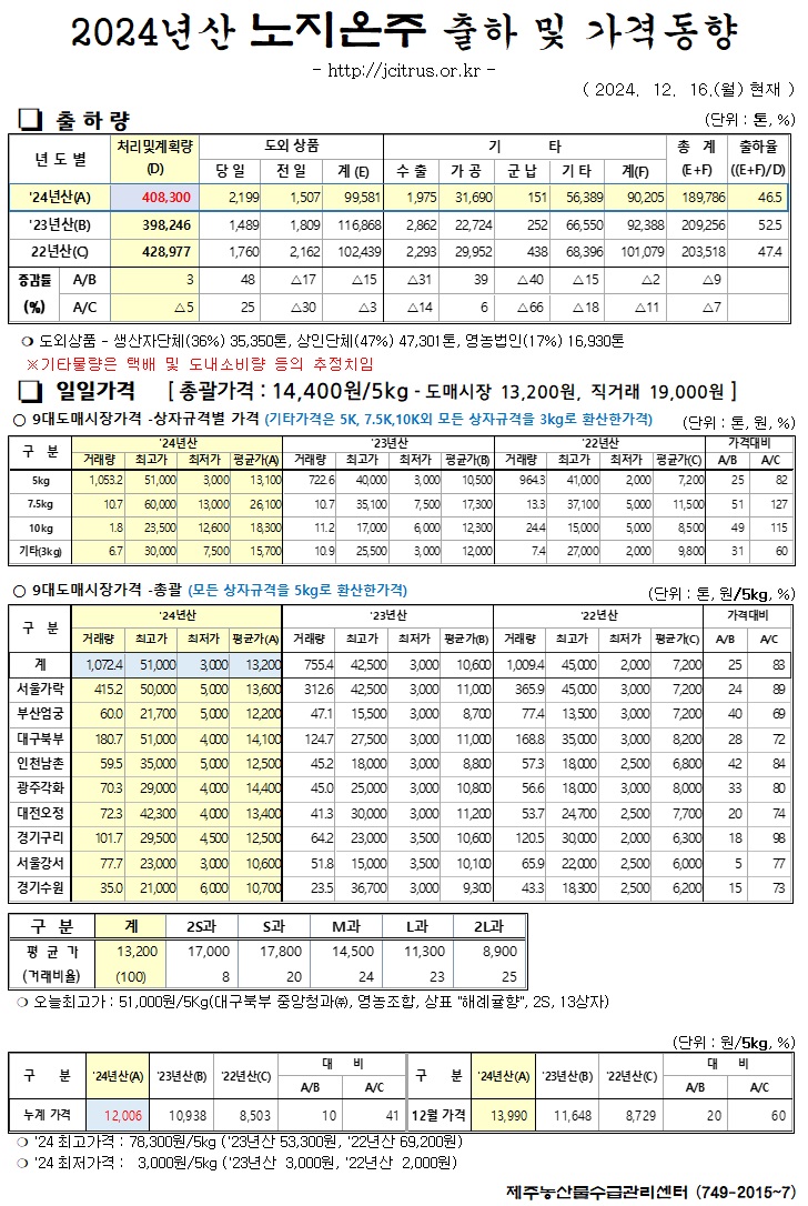 [노지온주]2024년산 출하 및 가격동향(12/16)