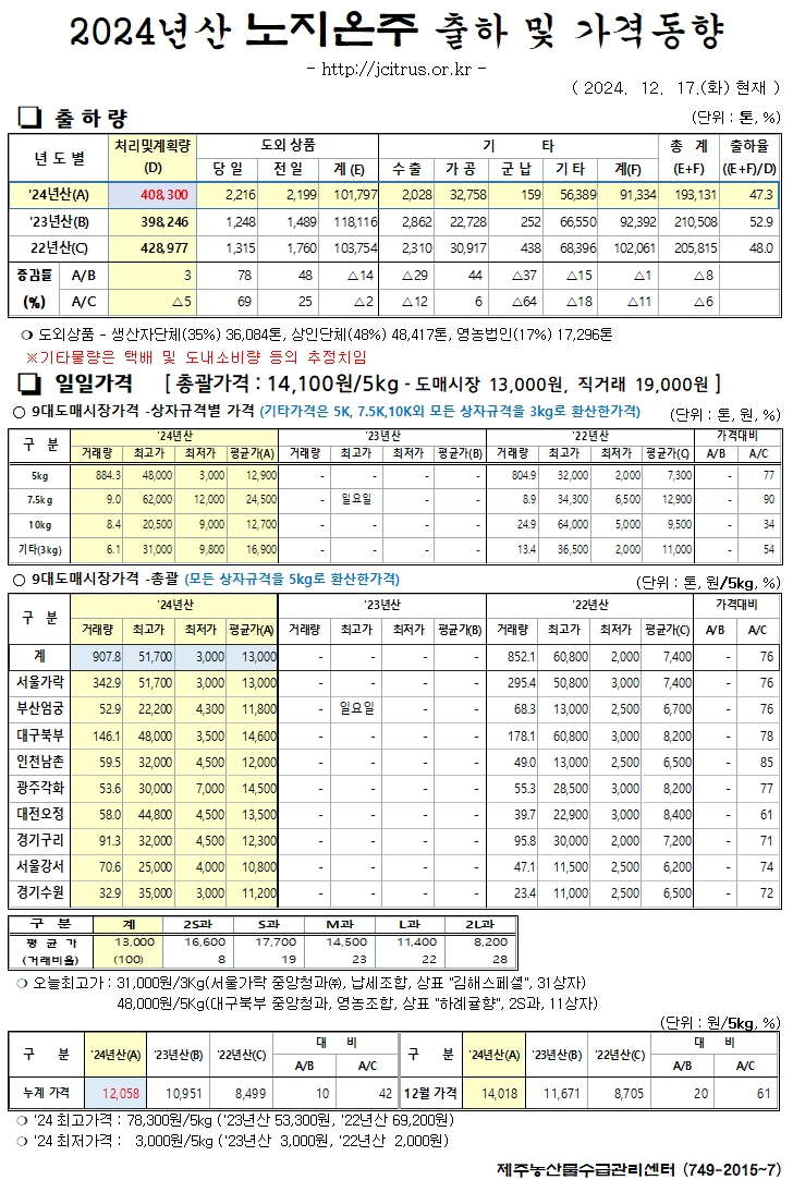 [노지온주]2024년산 출하 및 가격동향(12/17)