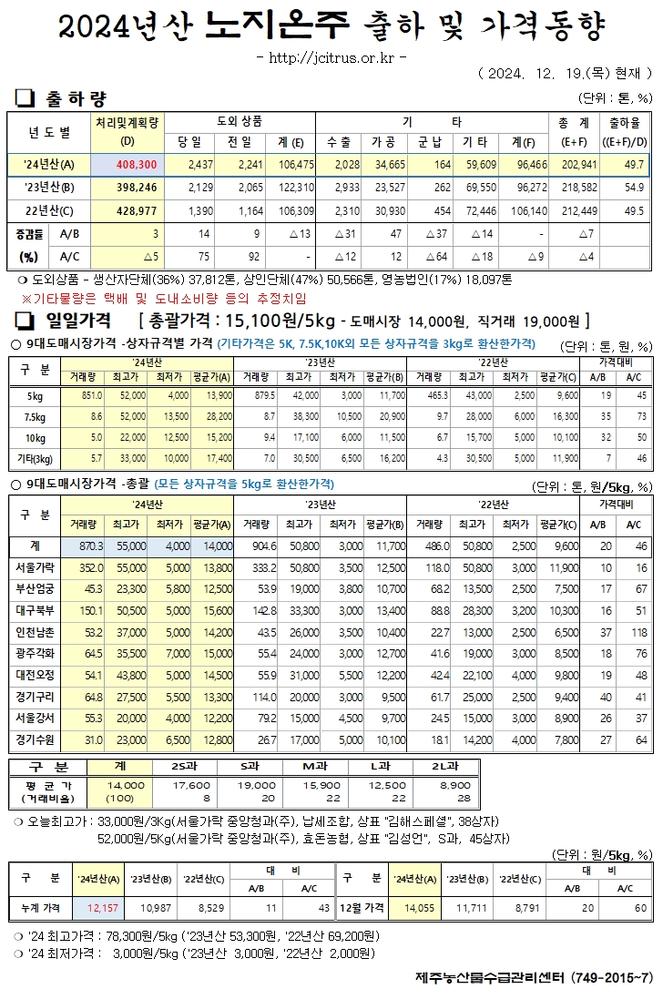 [노지온주]2024년산 출하 및 가격동향(12/19)